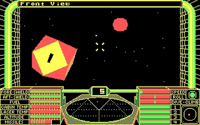 This version of Elite was restricted in its choice of display colours by the CGA palette, but it featured the full range of ships and a few secret missions. These included transporting some refugees from a system where the sun was about to go supernova, retrieving a masking device and destroying a Thargoid invasion base. |