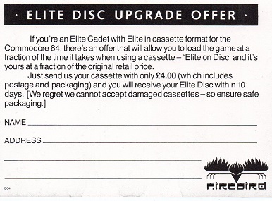 Click on the image to the left to view the complete Commodore 64 Elite disc package. As described above, the disc version was obtained on application to Firebird Software, using the upgrade card within the basic package. Therefore the remaining contents of the box were unchanged, the major benefit being the much faster loading times afforded by the 5¼" floppy disc. |
