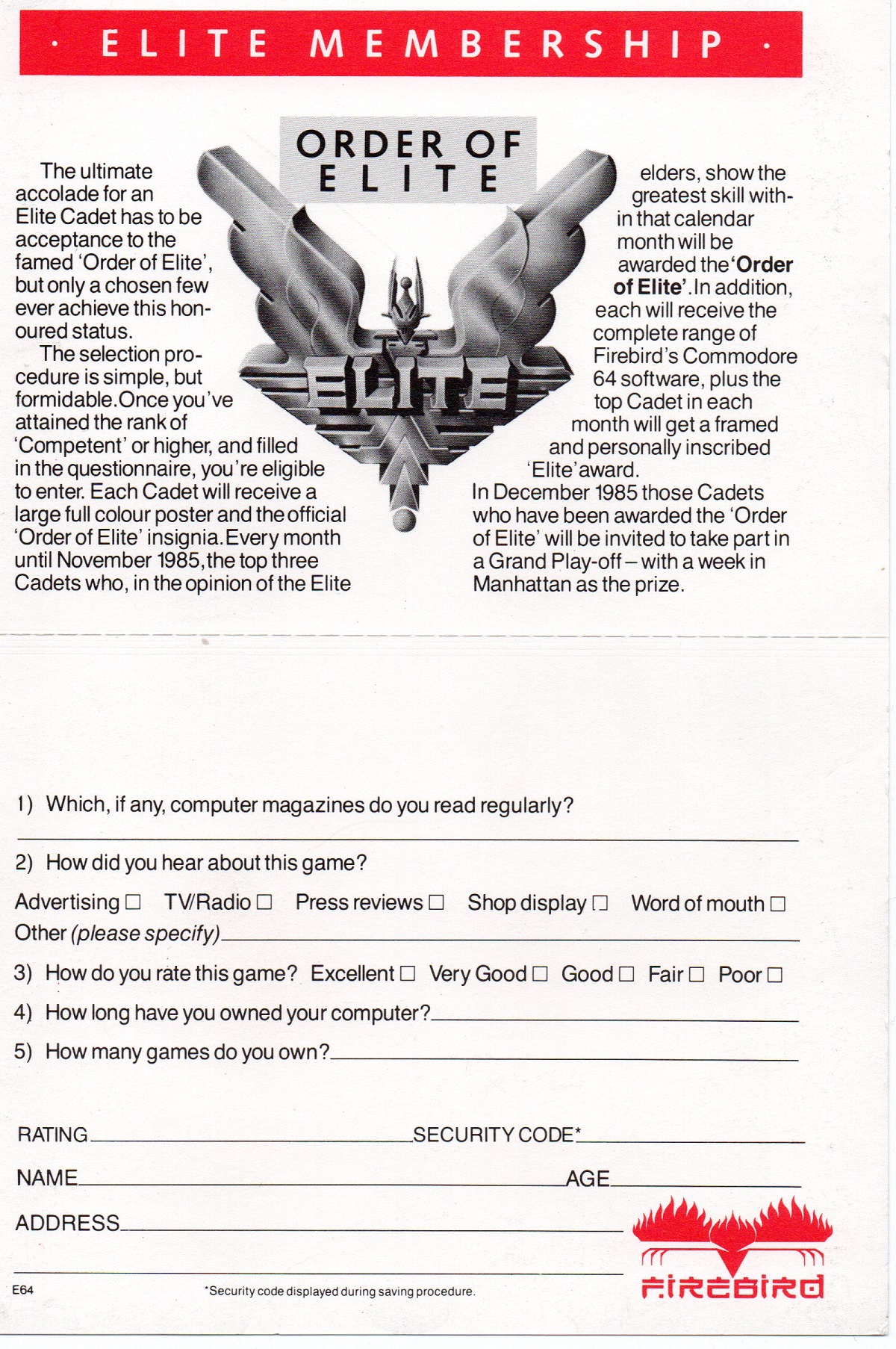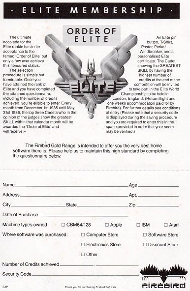 ![]() Those Commanders who had reached the combat rank of Competent (or above) could apply to Firebird for an Elite poster and 'Order Of Elite' insignia by completing and returning the questionnaire card included within the game pack. The top three Commanders each month would also be awarded further prizes and given the chance to enter a competition to win a holiday in the USA. |