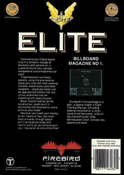 In early 1985, the Commodore 128 computer became available in the US, and was intended to use floppy discs for its media. When Firebird released Elite for the Commodore 64 in that country, they marketed it as being for both the 64 and 128 machines, as the 128 was largely compatible with the earlier machine. Given around 97% of C64 users in the US possessed the disc drive, it was unsurprising that this version retailed as disc only. |
