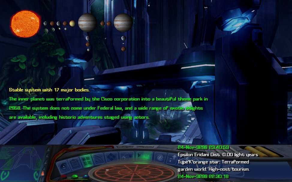 In Frontier, this system is famous for the Cisco Theme Park on New California, known throughout the galaxy for catering for every need and desire a person with sufficient credit can demand. | |